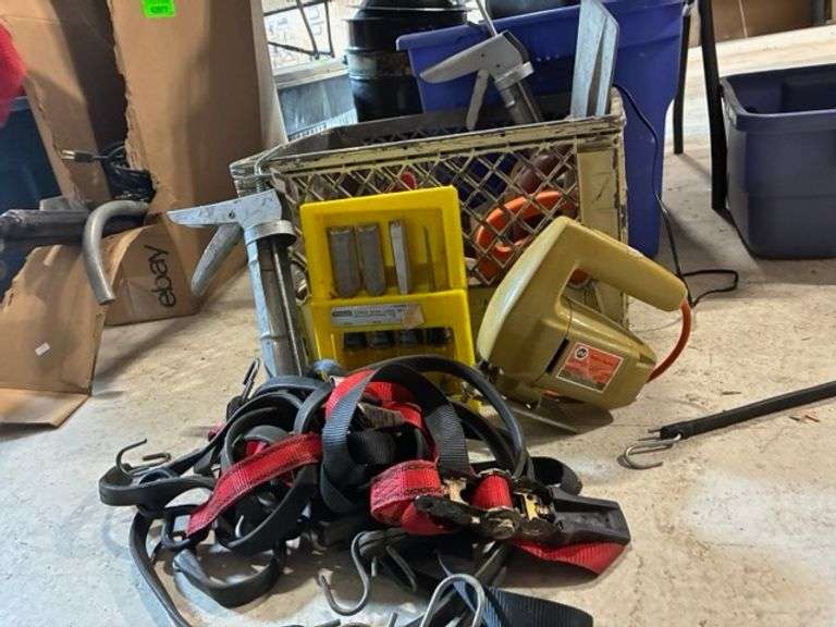 Assorted Straps, Chisels, Black and Decker Saw, Assorted Trowels Brushes and Funnels