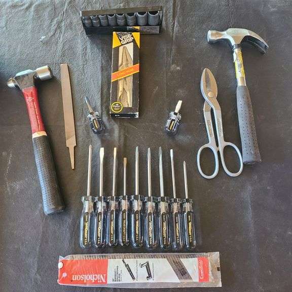 2) Hammers, Vise Grip Long Nose Pliers, Truecraft Screwdrivers, Blue Point Impact Sockets