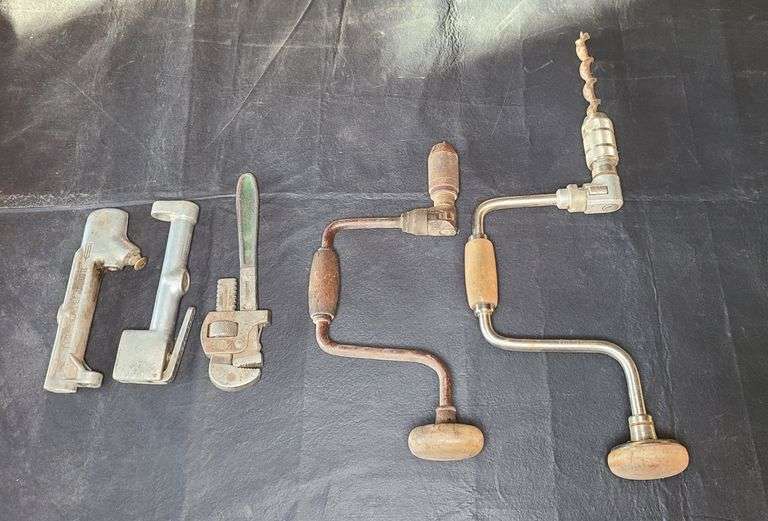 2) Vintage Hand Drills, Tru Flate Pressure Gauge, Milton Pressure Gauge, Monkey Wrench