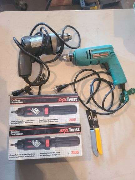 2) Skil Twist Cordless Screwdriver, 2) Pairing Knife, Reversible Drill, Corded Black and Decker Dril
