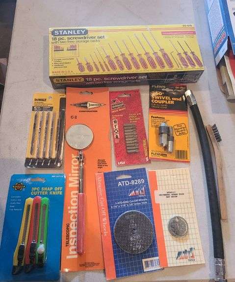 Stanley Screwdriver Set, Cutter Knife, Inspection Mirror, Dewalt Jig Saw Blades, Drill Bits, Grease