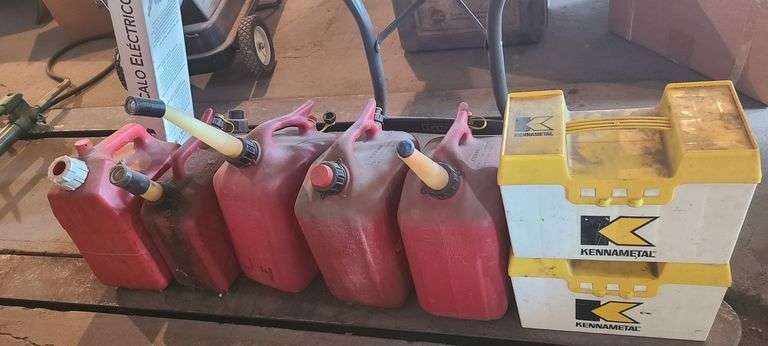 2) Kennametal Boxes with Assorted Tools, 5) Gas Cans