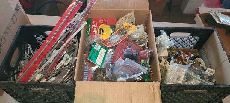 LOT 386 - 3) Milk Crates With Plumbing and Household Repair Items