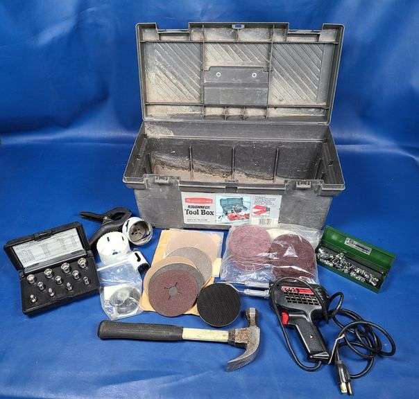 Toolbox with Contents: Sanding Discs, Soldering Gun, Hammer, Hole Saw Bits, Swivel Sockets, More