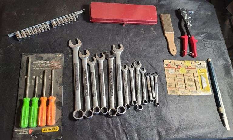 Craftsman Combination Wrenches, Stanley Screw Drivers, KTC Socket Wrench Set, Rivet Gun, 3) Vermont