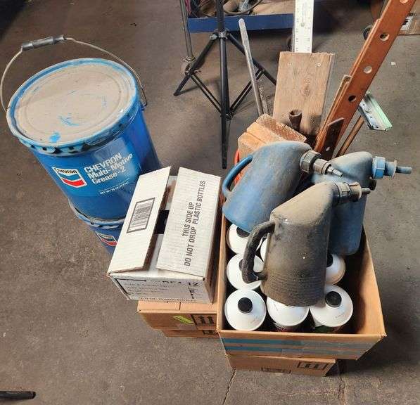 5) Cases of Brake Fluid, 3) Battery Filler Jug, 2) Partial Multi-Motive Grease - 2, Bucket with Cont