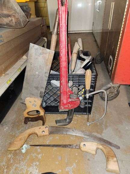 LOT 606 - Crate of Saws and Tools (2) Keyhole Saws, Handsaws, Pipe Wrench and More)