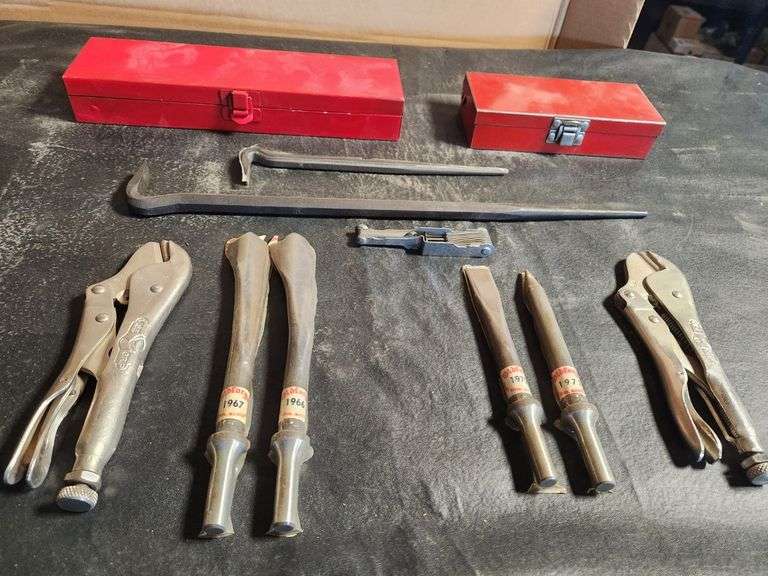 2) Crow-Bars, 2) Vise-Grips, 1967-1966-1972-1977 Specialty Chisels,2) Red Tool Box with Socket Bits