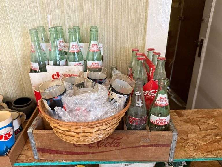 LOT 929 - Collection of Coca Cola Bottles, Cups, Wooden Crate, 2) Glass Jars, Decorative Jar