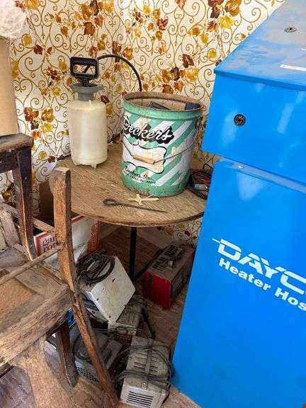 Table, Can with Contents, Sprayer, Variety of Battery Chargers