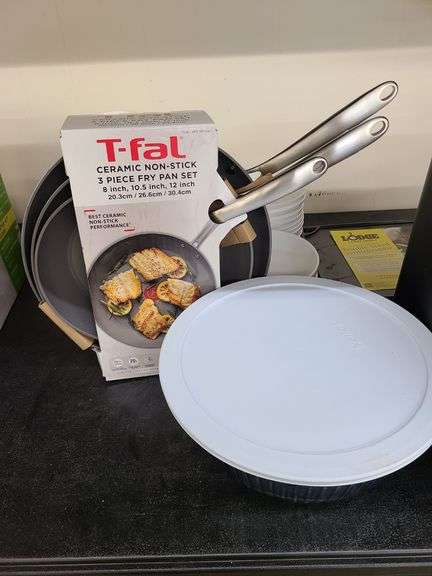 1) T-Fal Ceramic Non-Stick 3pc Fry Pan Set, 1) Pyrex Glass Mixing Bowls with Lids