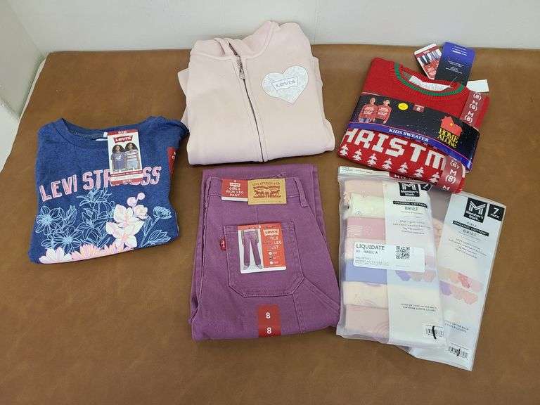 Girls Size 7/8 & 8: 1) 2pk Levi's Shirts, 1) Levi's Wide Leg Pant, 1) Levi's Jacket, 1) Christmas Sweater, 2) Organic Cotton Briefs