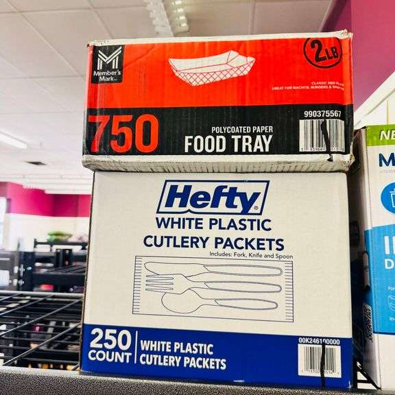 1) Food Tray 750 Ct 1) Hefty White Plastic Cutlery Packets 250 Ct