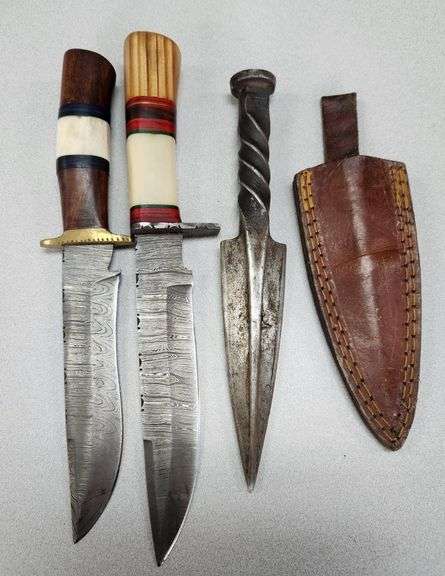 2) Damascus Knives, 1) Railroad Spike Dagger