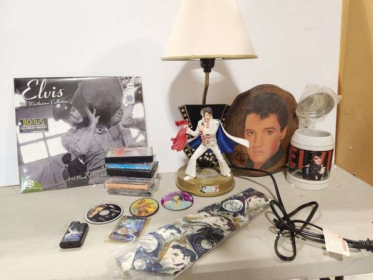 Elvis Memorabilia ( Tie, Beer Stein, Wooden Plaque, Lamp, Record, Tapes and More)
